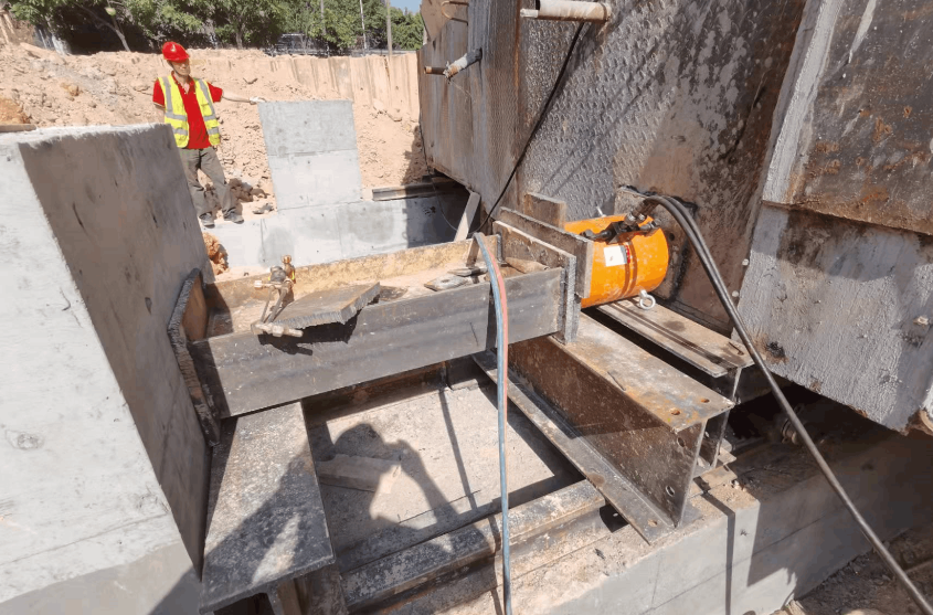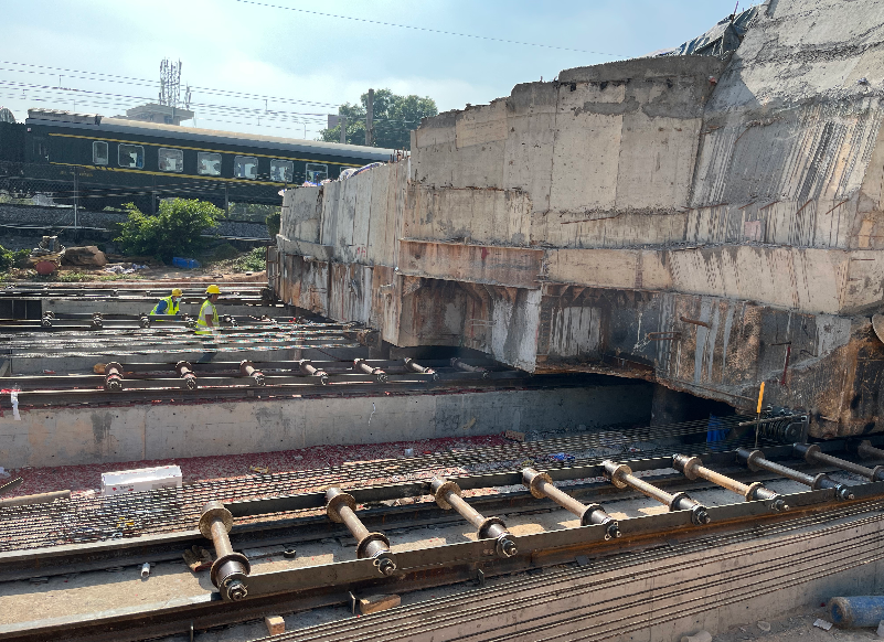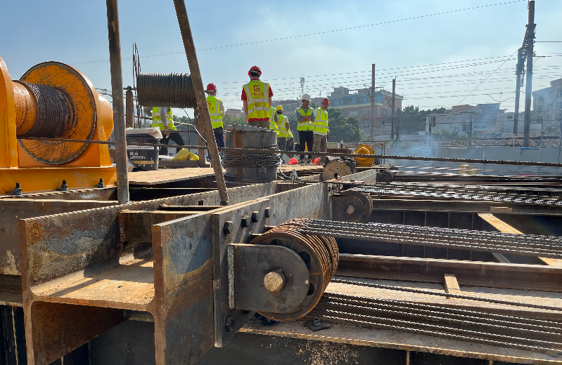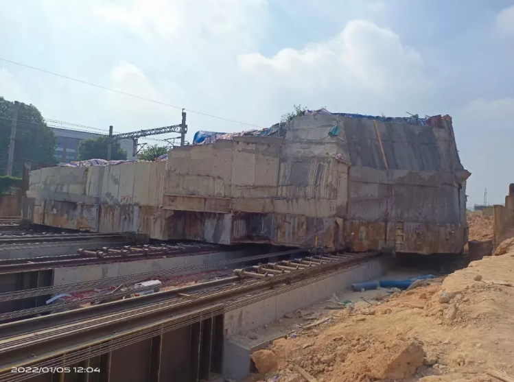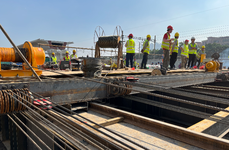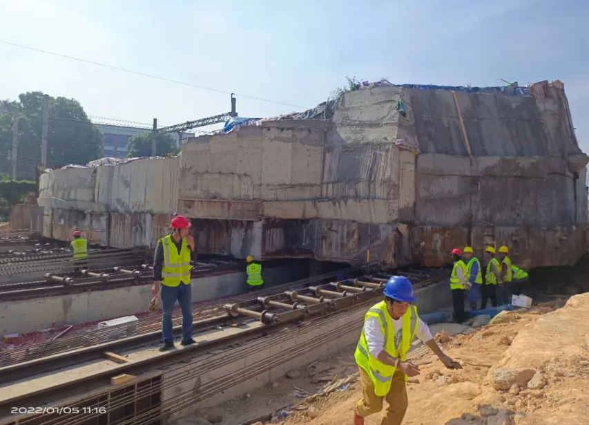我司采用了卷揚機及配套安裝6zuhualunzudeqianyinfangan。zaiyizhiqianfang,zhizuoyigeganggouqianyinpingtai,hengwoyuyijianhaodesitiaogangxiangliangguidaoshang,tongguolaganjigaoqiangluoshuanguding。qianyinpingtaishanganzhuangliangtaiqianyinjuanyangji。qianyinpingtaijiyizhijiangeanzhuangliutaohualunzu,raoguogangsishengfenbieyuliangtaiqianyinjuanyangjixianglianjie,shiyizhidadaohuanmanqianxingxiaoguo。bingtongguoduozuhualunxiaoying,jiangwujiandepingyisudukongzhizai20cm/min以內。用同樣的方法,在遺址後方也製作一個鋼構製動平台,確保整個平移過程能動也能停。